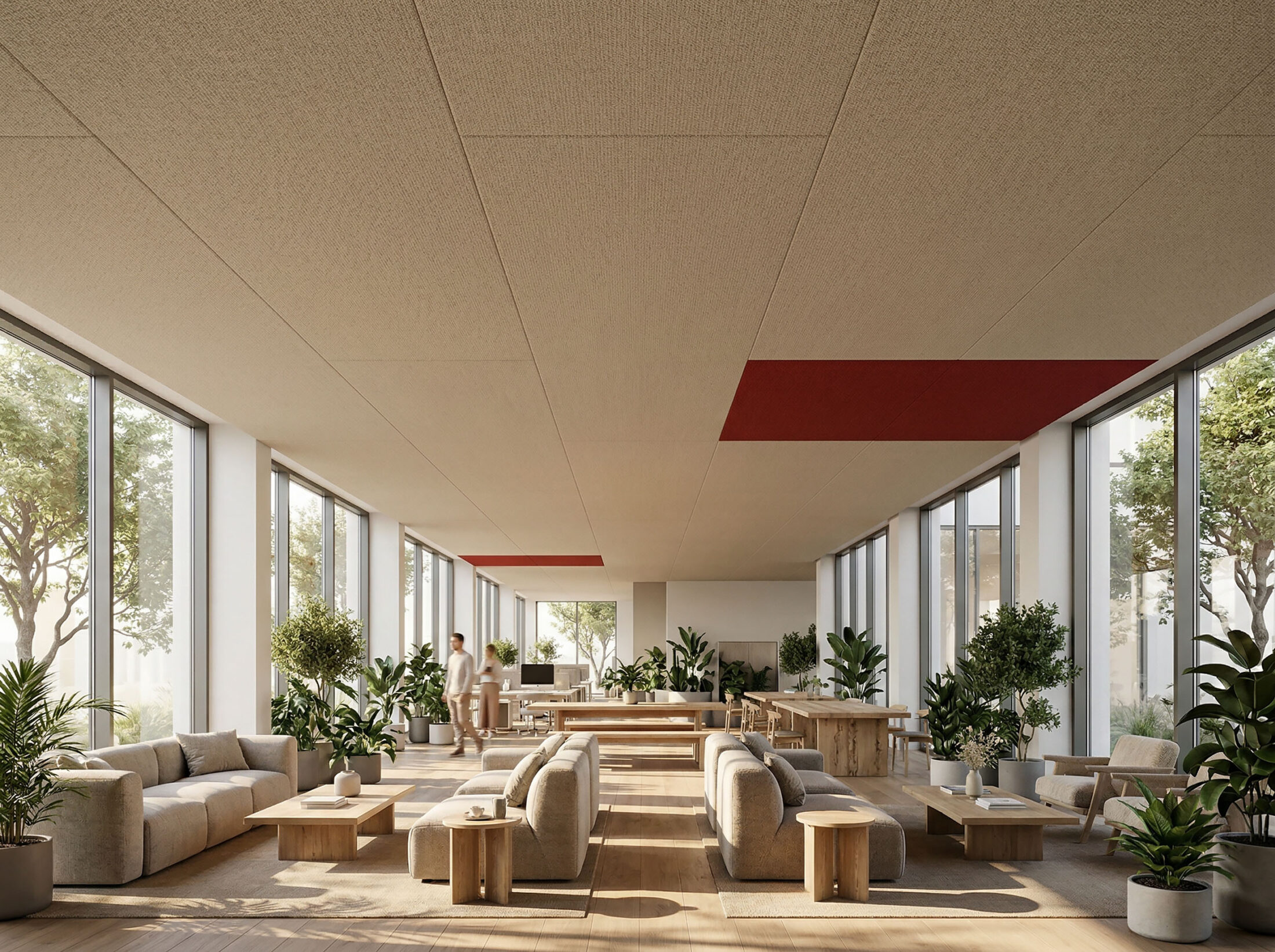 Das reduziert Nachhallzeiten spürbar und minimiert störende Schallreflexionen unabhängig davon, ob es sich um Büroflächen, Besprechungsräume oder öffentliche Bereiche handelt.