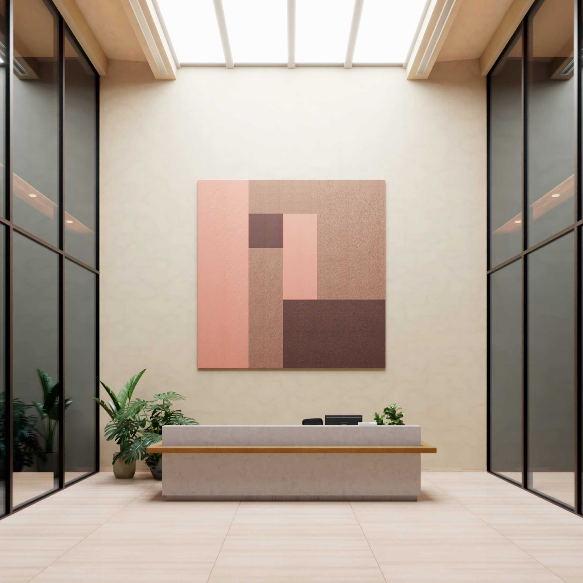 Sonic-Unity ist für durchgängige Oberflächen und eine reduzierte architektonische Sprache entwickelt. Sichtbare Profile und konstruktive Übergänge entfallen bewusst. Es entsteht eine ruhige, homogene Wirkung mit präziser Linienführung ohne visuelle Unterbrechung. Der Aluminiumrahmen bleibt als stabile Basis im Hintergrund. Er gewährleistet die Formstabilität und eine dauerhaft leistungsfähige Akustiklösung.