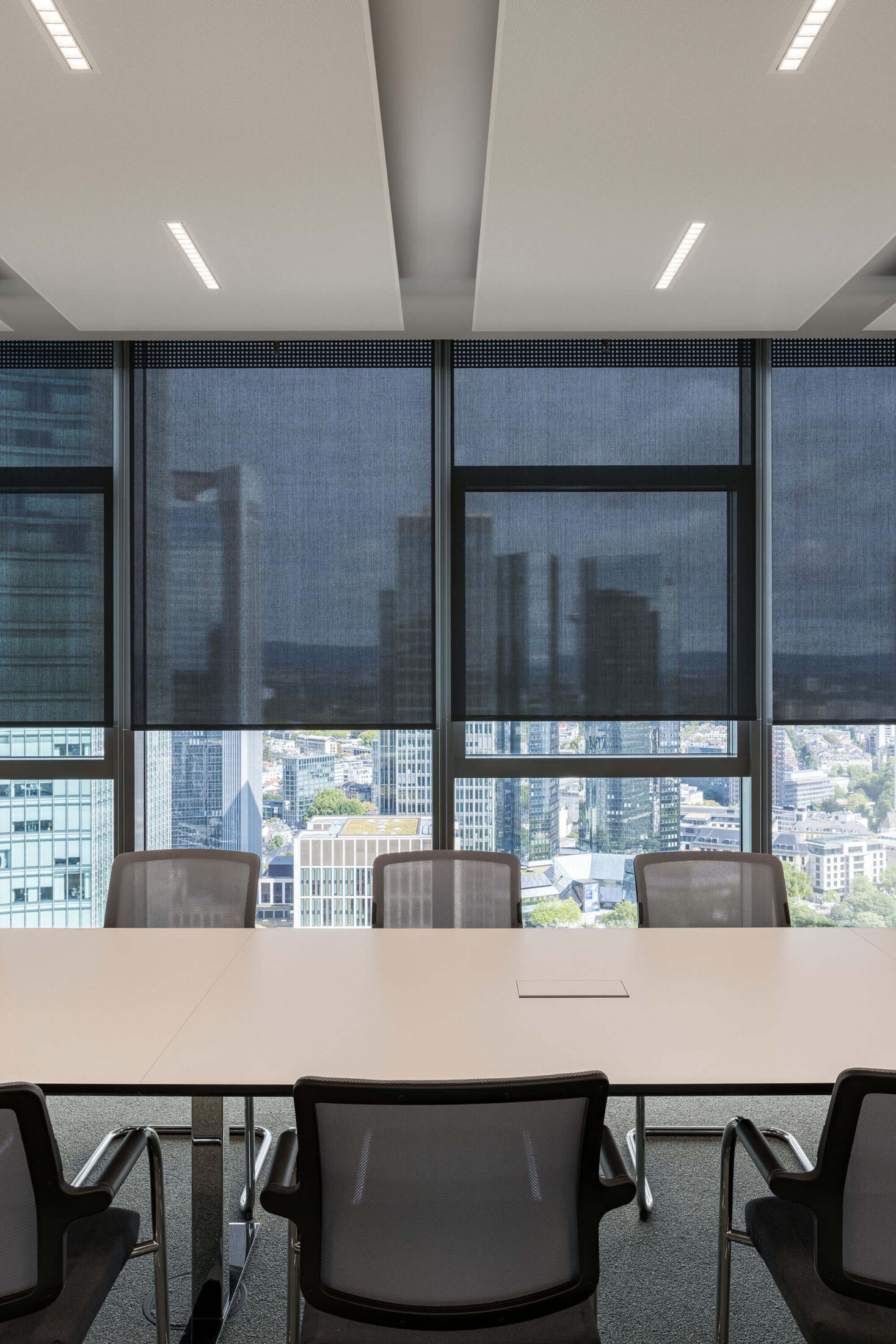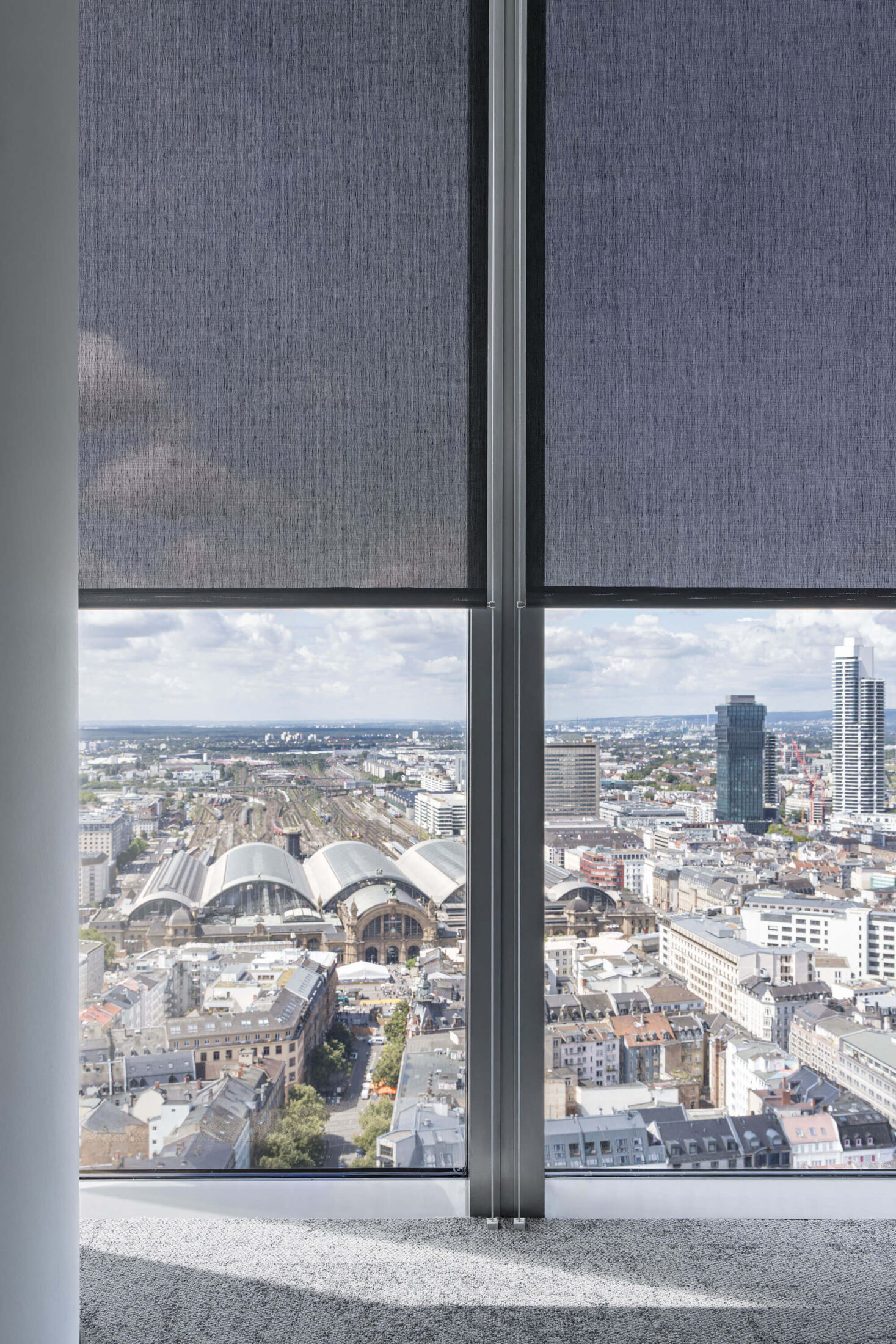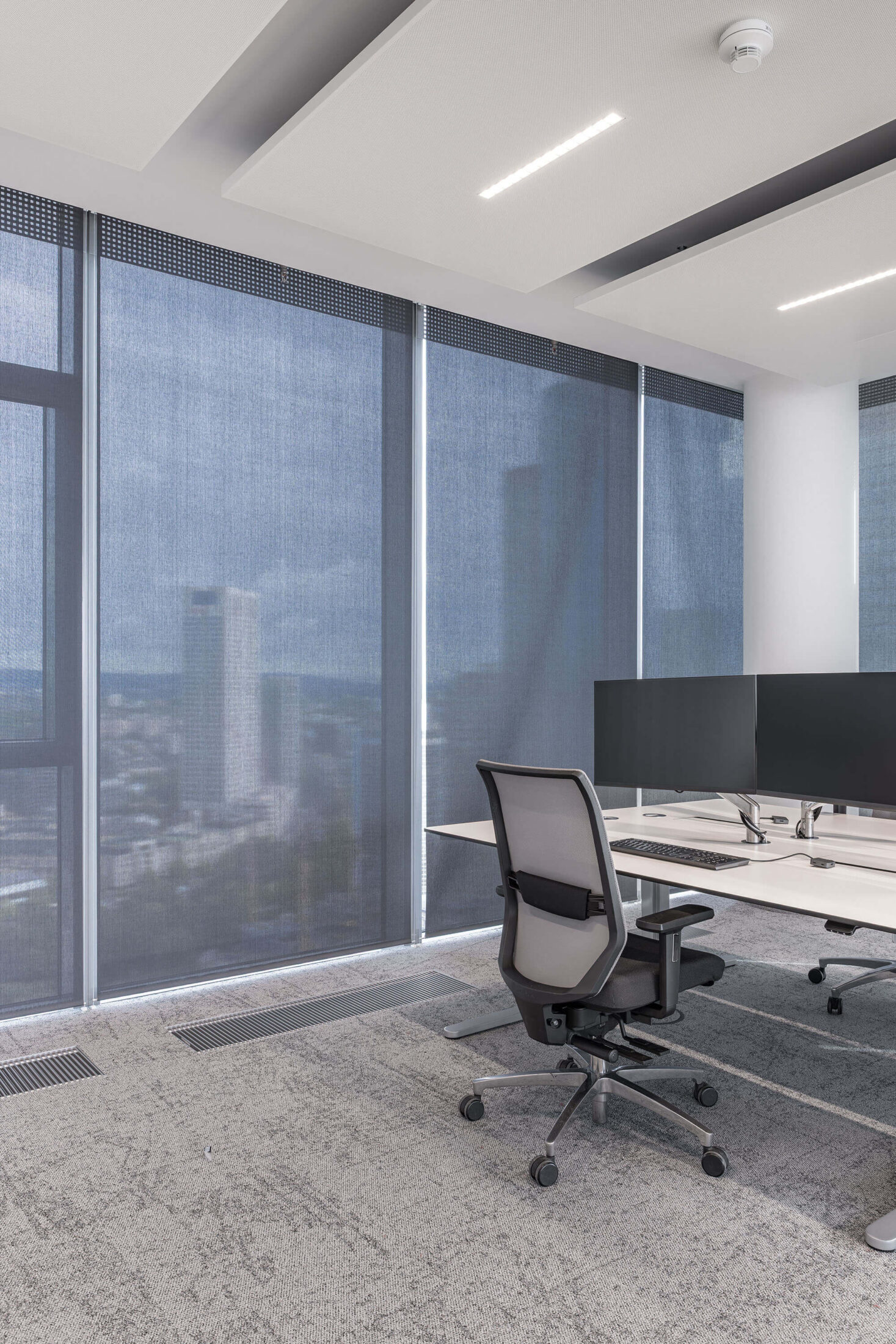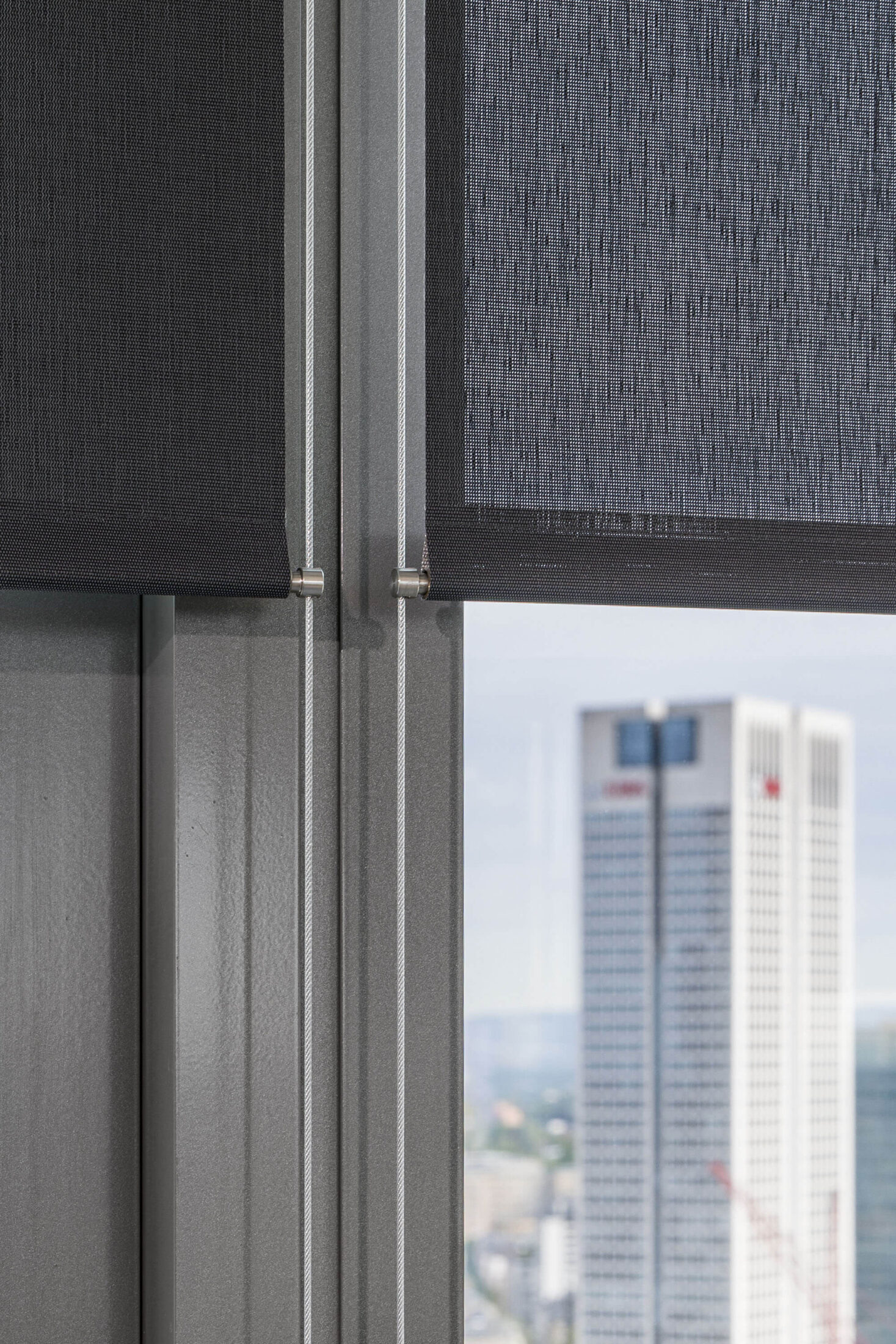 Die zuvor installierten Innenjalousien wurden durch elektrische Kassettenrollos mit Seilführung ersetzt. Von Beginn an war klar: Die textile Lösung musste höchsten Ansprüchen genügen. Der SilverScreen 2-%-Behang bietet mit seinen hervorragenden technischen Eigenschaften optimalen Blendschutz, gute Durchsicht und erfüllt die Anforderungen an den sommerlichen Wärmeschutz nach DIN EN 14501:2021.
