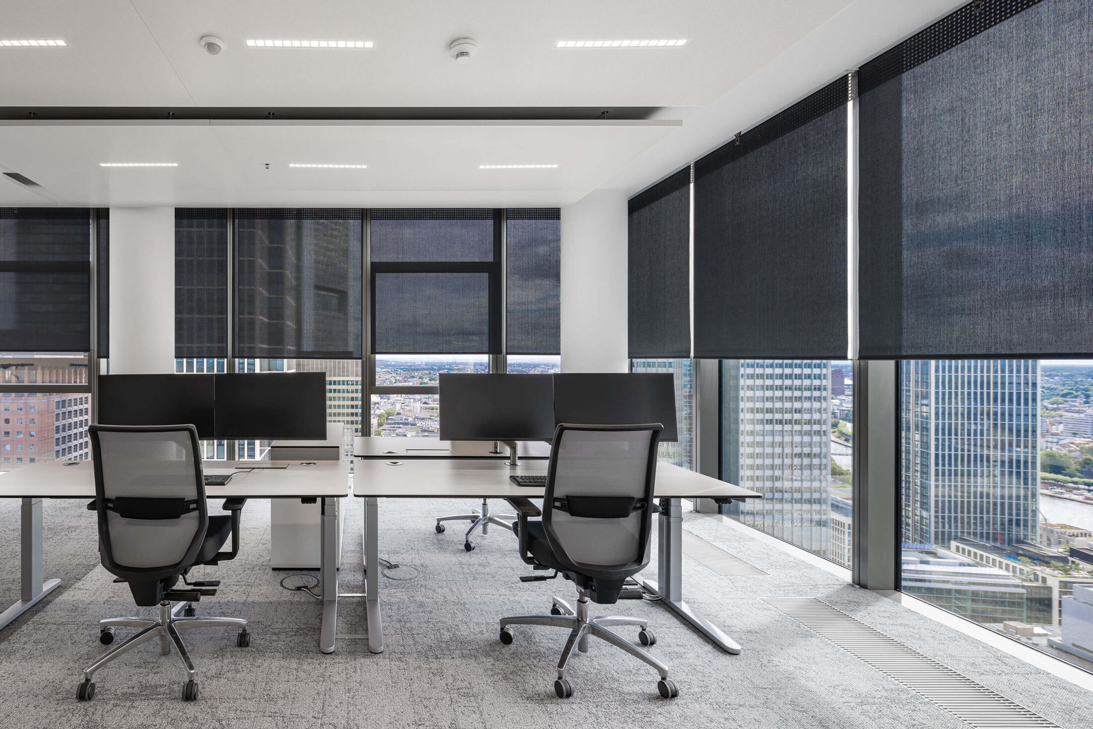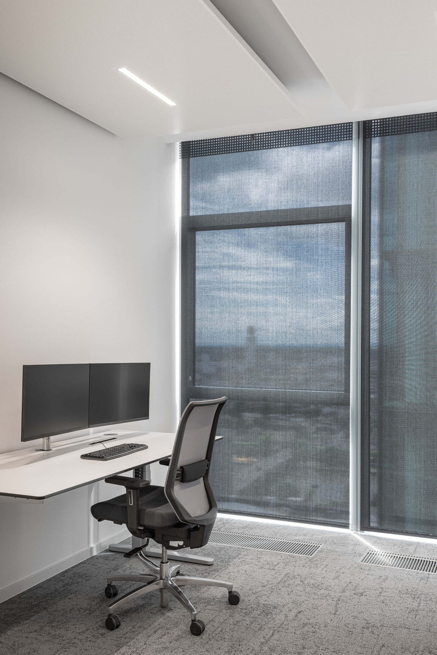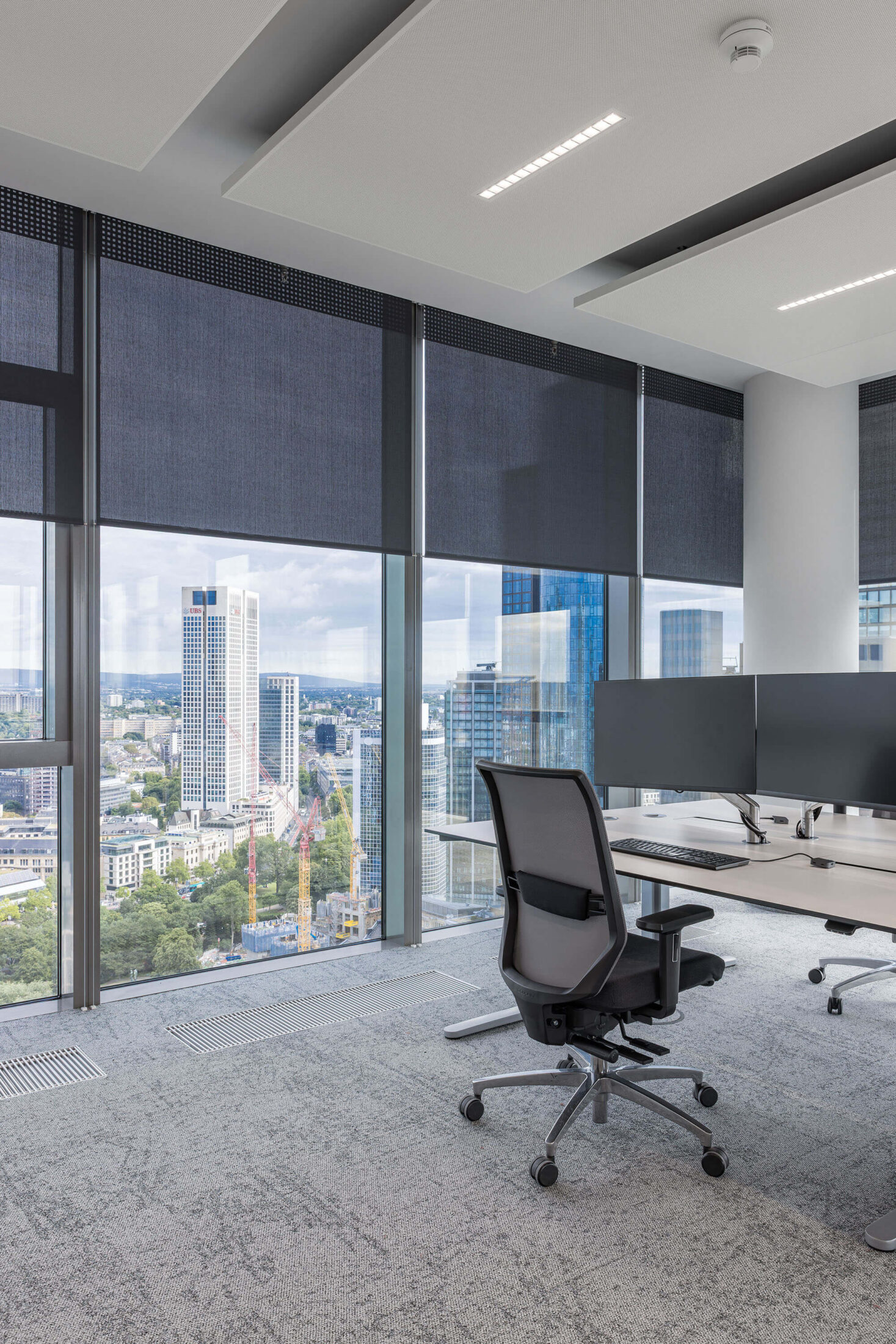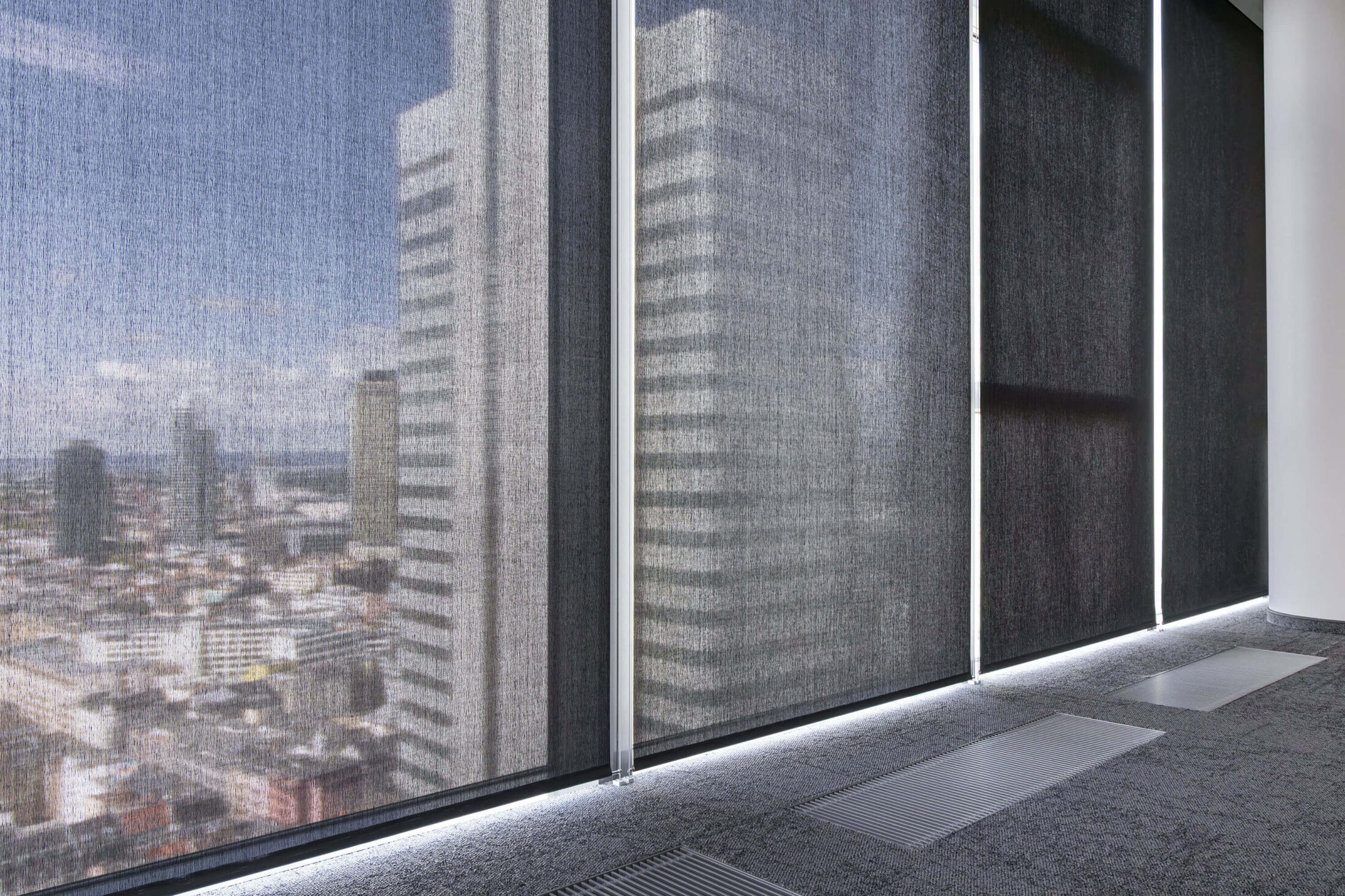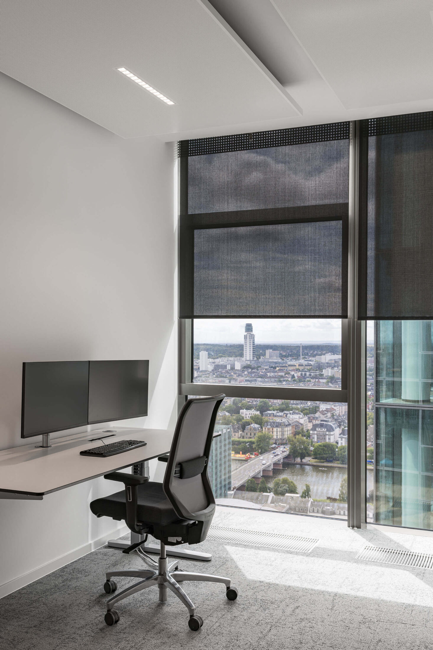 Die zuvor installierten Innenjalousien wurden durch elektrische Kassettenrollos mit Seilführung ersetzt. Von Beginn an war klar: Die textile Lösung musste höchsten Ansprüchen genügen. Der SilverScreen 2-%-Behang bietet mit seinen hervorragenden technischen Eigenschaften optimalen Blendschutz, gute Durchsicht und erfüllt die Anforderungen an den sommerlichen Wärmeschutz nach DIN EN 14501:2021.