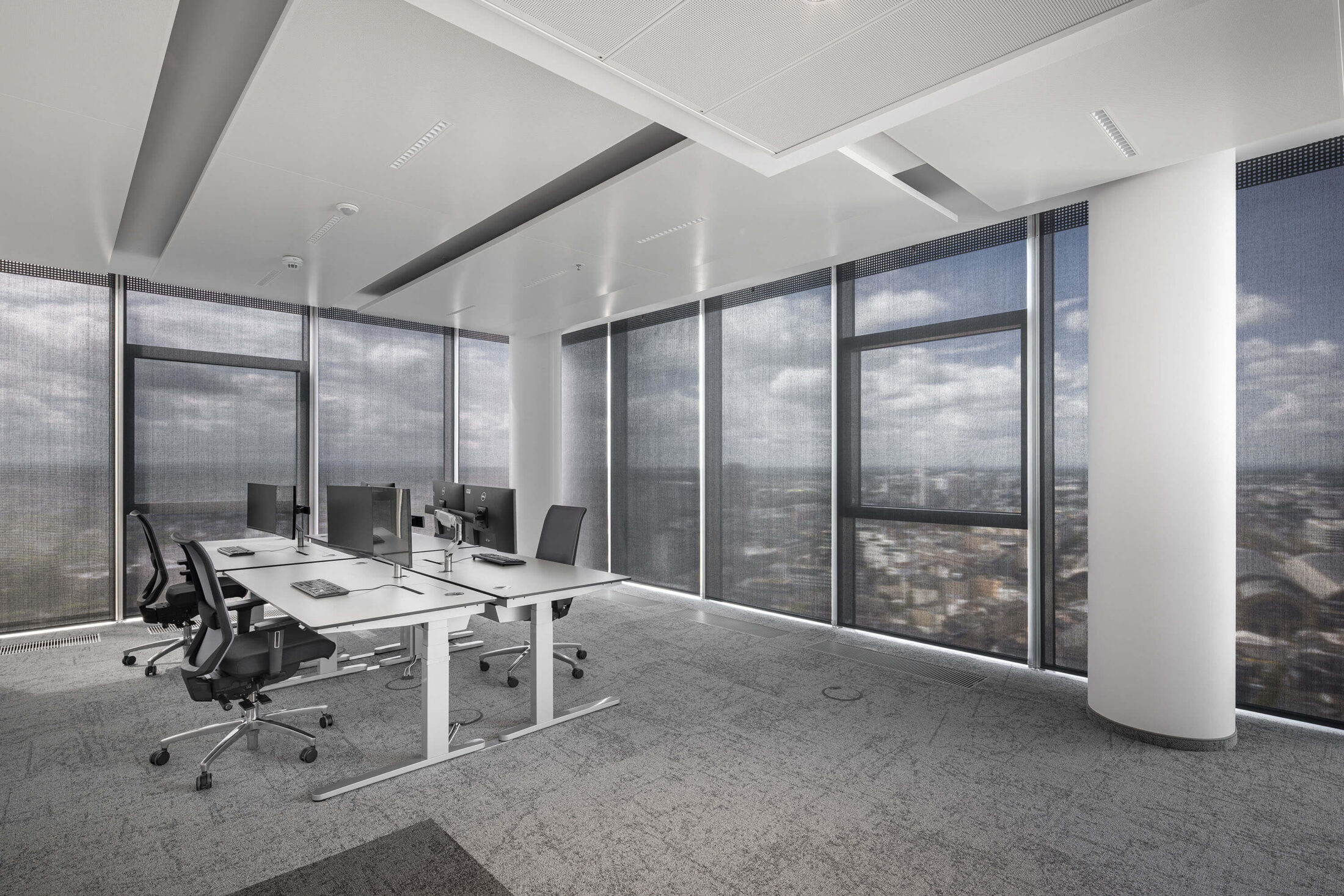 Dank seiner metallisierten Rückseite bietet SilverScreen einen Sonnenreflexionsgrad von 85 %, ein optimales Wärme- und Lichtmanagement sowie mit dem niedrigsten Low-E-Wert auf dem Markt (Emissionsgrad 0,03) hervorragende Dämmeigenschaften. Ein Öffnungsfaktor von 2 % ermöglicht eine ausgezeichnete Durchsicht, während die besten Blendschutzwerte (Klasse 4) ideal für Bildschirmarbeitsplätze sind.